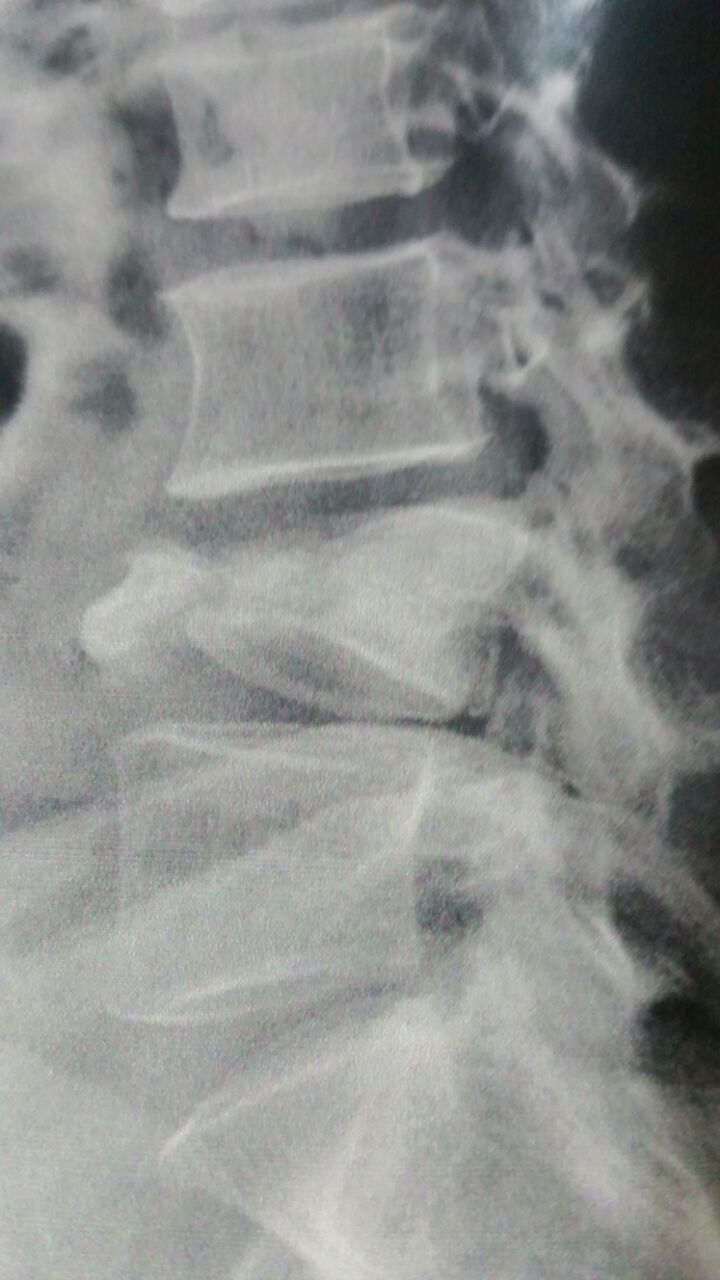 Imagem radiológica de fratura de vértebra lombar.